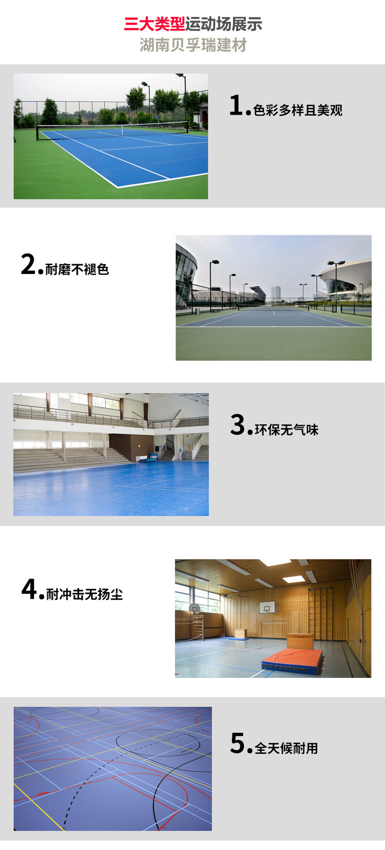 5、技術(shù)穩(wěn)定性:無(wú)論是大球還是小球的回彈性、吸震性及摩擦系數(shù)能貫穿整個(gè)場(chǎng)地系統(tǒng),保證其技術(shù)穩(wěn)定性。6、理想的綜合功能:適用于室內(nèi)外籃球場(chǎng),網(wǎng)球場(chǎng),排球場(chǎng),羽毛球場(chǎng),手球場(chǎng),休閑場(chǎng)地,健身房等多項(xiàng)運(yùn)動(dòng)地面。